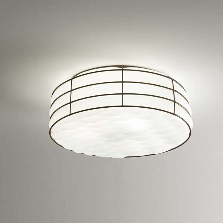 Tamis, resembling a sieve, is a ceiling lamp that exudes simplicity in its shape and in the blowing of the glass. The blown glass exceeds the limit of the cage at the bottom, simulating a sagging of the structure, recreating with the glass the same design as the steel filaments.