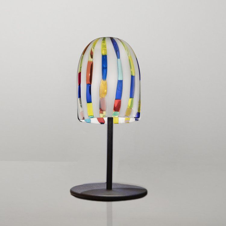 nine types of textures enrich the simple shape of this bell that is always different in its features, obtained with an ancient hot decorative technique that involves the fusion of rods containing smooth threads of milk-white or coloured glass. Joyful individually, it becomes the perfect solution for custommade projects with an extremely creative look.