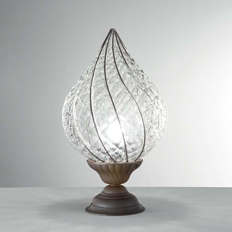 a fluid form, the soft colours shining through the reliefs of the glass blown with the balotton technique, the cage in slight torsion almost suggesting a configuration of unstable equilibrium.