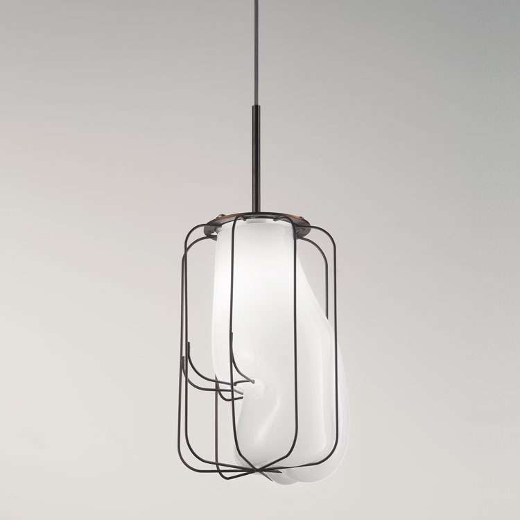 Sometimes stopping to change direction is an opportunity. Gum Design reinterprets the concept of free and asymmetrical glass blowing, proposing this lamp with an industrial flavour that is perfect for contemporary interiors. The blown glass encounters obstacles on its path inside the cage that force the development of an imperfect form: the crystallisation of the glass takes place each time in a different way, developing